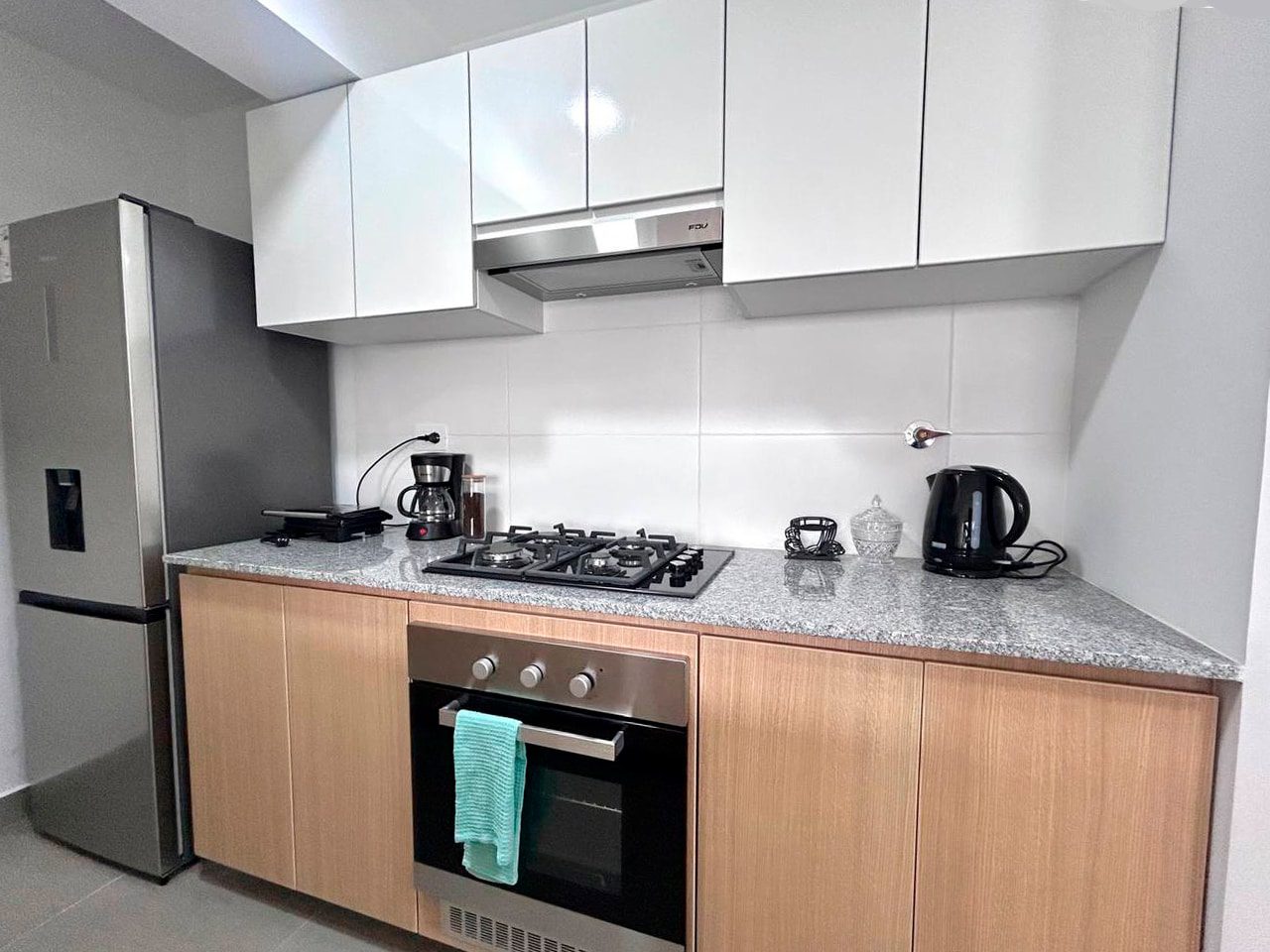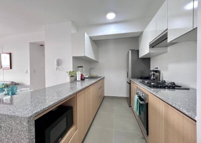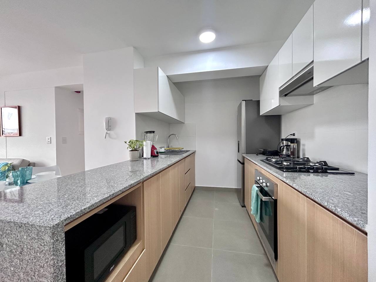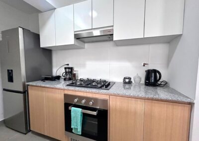 Cocina equipada (refrigeradora, cocina, horno, microondas, licuadora, grill, cafetera, hervidor, ollas, cubiertos y vajilla)